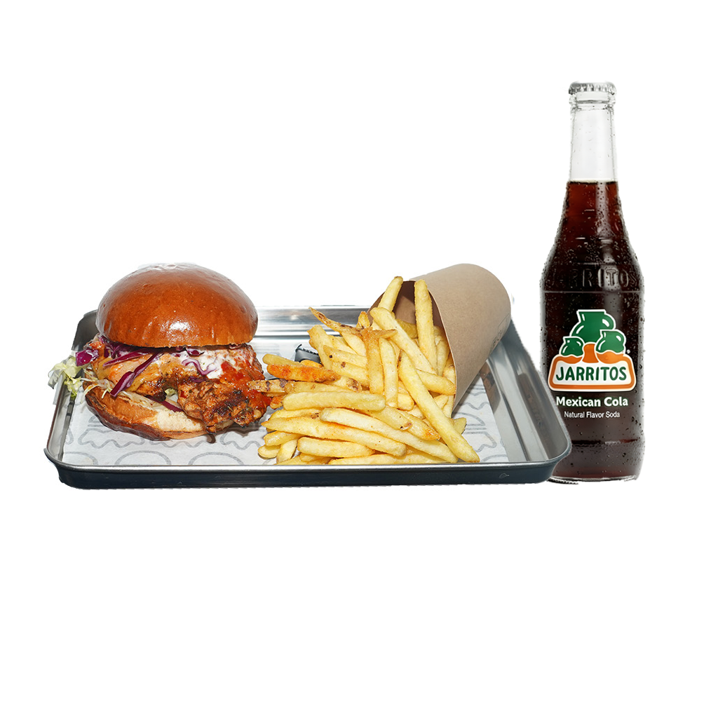 Spicy coated chicken breast, cheese, shredded lettuce, red onion, house slaw, jalapenos, house sauce served in a demi-brioche potato bun, skin on fries and soft drink.
