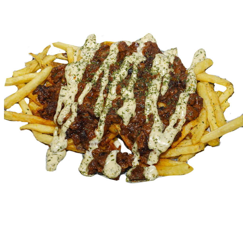 Skin on fires topped with cripsy diced chicken tossed in our house sweet chilli, cheese and white sauce.